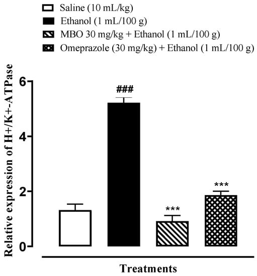 Effects of MBO in H+/K+-ATPase expression in ethanol-induced gastric ulcer model. The mRNA levels of H+/K+-ATPase were measured by RT-PCR using specific primers. Significance at *** p < 0.001 vs. ethanol group; ### p < 0.001 versus saline group. Analyzed by one-way ANOVA followed by posthoc Tukey’s test.