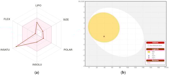 (a) Bioavailability radar chart for isolated flavone. The pink zone represents the physicochemical space for oral bioavailability, and the red line represents the oral bioavailability properties. (b) Predicted BOILED-Egg plot from swiss ADME online web tool for MBO.