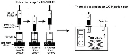 Diagram of HS-SPME device procedure [67]. Reprinted from Journal of Chromatography A, vol 880, Kataoka H, Lord LH, Pawliszyn J, Applications of solid phase microextraction in food analysis, pg. 35–62, Copyright (2000), with permission of Elsevier.