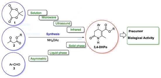 The synthesis of 3,4-DHPo derivatives has been important with the passing of time. Different synthetic procedures to synthesize them have taken place in the last years, although the most reported uses are the multicomponent reaction (MCR-4CR) of Meldrum’s acid (1), a β-keto-ester derivative (2), and aromatic aldehydes (3) in the presence of ammonium acetate. Additionally, a broad range of techniques have been covered, from the conventional synthesis, through energy resources such as microwave, ultrasound, and infrared assisted to solid and liquid phase synthesis, and recently the chemoenzymatic assisted methodology applied to their asymmetric synthesis (Scheme 1).