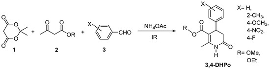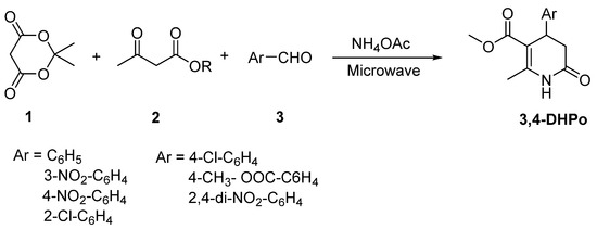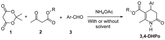 In 2003, our group reported the first solvent-free and accessible one-pot condensation reaction of Meldrum’s acid (1) in the presence of methyl acetate (2), aldehyde derivatives (3), and ammonium acetate to obtained 4-aryl substituted 5-alkoxycarbonyl- 6-methyl-3,4-dihydropyridones (3,4-DHPo) [20]. The mixtures were irradiated at controlled temperatures and times with continuous mechanical stirring, which provided a good homogeneity of materials and 81–91% yields (Scheme 10).