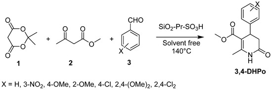 Furthermore, the Hakimi research group reported a new one-pot, four-component synthesis of 3,4-dihydro-2-pyridone derivatives (3,4-DHPo). The reaction of Meldrum’s acid (1), methyl acetoacetate (2), benzaldehyde derivatives (3), and ammonium acetate and using SiO2-Pr-SO3H as an efficient catalyst under solvent-free conditions was reported (Scheme 5) [34]. The advantages of this methodology are high product yields (78–93%), being environmentally benign, short reaction times, and easy handling.