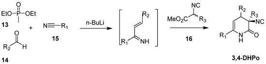 Paravidino et al. developed a novel four-multicomponent reaction (4CR) of phosphonate (13), aldehydes derivatives (14), nitriles (15), and α-acidic isonitriles (16) to obtain 3,4-DHPo derivatives in 53–88% of yield and with complete diastereoselectivity in favor of the cis-diastereomer (Scheme 8) [51,52].
