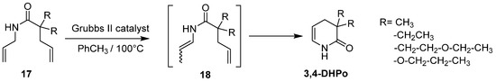 Another report showed the synthesis of 3,4-DHPo derivatives via tandem olefins isomerization–RCM reaction, through the in situ generated intermediate 18 from readily available N-Allyl amines type 17 as dienes catalyzed by second-generation Grubbs catalyst (ruthenium catalysts) and heated to obtain 3,4-DHPo derivatives with 57–85% yield (Scheme 9) [53].