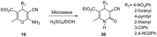 Besides, Hernandez et al. published the oxidation reaction of 4H-pyrans derivatives (19) to obtain 3-cyano-2-pyridones (20) in ethanol, using H2SO4 catalyst source and MW irradiation (Scheme 11) [57]. These compounds are hybrid milrinone–enifedipine analogs.