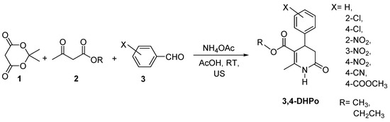 The ultrasonic activation is based on cavitation effects, allowing this technique to improve the mass transfer in several organic reactions reported. In 2011, our group published the synthesis of 4-aryl 3,4-dihydropyridone derivatives (3,4-DHPo) by ultrasound-assisted technique, through the one-step condensation of Meldrum’s acid (1), alkyl acetoacetates (2), aromatic aldehydes (3), and ammonium acetate, using glacial acetic acid as solvent, at room temperature, and obtained high yields (Scheme 12) [58].