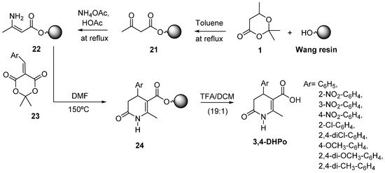 One of the most commonly used techniques in combinatorial chemistry is Solid-Phase Organic Synthesis (SPOS), because it allows the rapid synthesis of many structurally diverse molecules in a short time. In 2006, our group published the first SPOS of 3,4-DHPo derivatives following a solid-support assisted synthetic strategy (Scheme 14) [60]. The immobilized acetoacetate (21) was obtained by reaction of 2,2,6-trimethyl-1,3-dioxin-4-one (1) and Wang resin (0.92 mmol OH/g); the further reaction of 21 in the presence of NH4OAc and HOAc led to the corresponding immobilized enamine (22), which reacted with the Knovenagel derivatives (23) to afford the expected immobilized 3,4-DHPo (24). The heterocycle was cleaved from the resin with 71–85% overall yield (Scheme 14) [60].