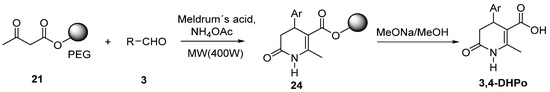 The employment of soluble polymers as supports in organic synthesis is known as liquid-phase synthesis (LPS). In 2008, Fu et al. reported the LPS of 4-substituted-5-methoxycarbonyl-6-methyl-3,4-dihydropyridones on polyethylene glycol (PEG) 4000 assisted by MW irradiation (Scheme 15) [62]. First, the acetoacetylation of PEG was realized to obtain the immobilized acetoacetate (21); further, condensation of 21 with aldehyde derivative (3), Meldrum’s acid in the presence of ammonium acetate, and solvent-free assisted by microwave irradiation allowed to obtain the immobilized 3,4-DHPo (24). The target compound 3,4-DHPo was obtained after cleavage using NaOMe in MeOH with 88–95% yield.