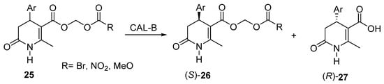 Another enzymatic multicomponent reaction (EMCR) was reported using benzaldehyde, cyanoacetamide, ketone, and Acylaze Amano (AA)-catalyzed. This single enzymatic catalyzed reaction is attractive due to its high atom economy, easy work-up process, tolerance to a wide range of substituted reagents (benzaldehyde and ketones), and all mild conditions [65]. The best result was shown in the enzymatic hydrolysis of 4-aryl-5-(tert-butoxycarbonyl)-6-methyl-3,4-dihydro-2(1H)-pyridones with CAL-B enzyme and TMBE as a solvent to obtain high ee (93–95%) and moderate yields (30–31%) of (S)-derivative (26).