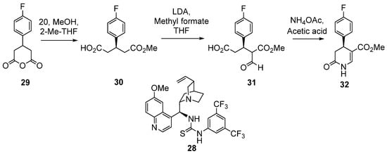 On the other side, Huang et al. reported the first asymmetric synthesis of 3,4-DHPo derivatives [66]. The formation of monoacid (R)-30 was carried out by desymmetrization or asymmetric methanolysis of prochiral anhydride (29) using the organocatalyst 28, 2-Me-THF, and MeOH as solvents (Scheme 17). The conversion was 100%, and the best-observed ee of 80%. The next step was the selective formylation to obtain the intermediate 31, and finally, the cyclization of 31 with ammonium acetate using acetic acid achieved the final product (R)-32, with an overall yield of three steps 48% and >95% ee (Scheme 17) [66]. The same group also reported the pilot-scale enantioselective synthesis of 32 and kilogram-scale production of N-methyl derivative of 32 in an excellent overall yield of ~22% with excellent stereochemical purity (97% ee) [13].