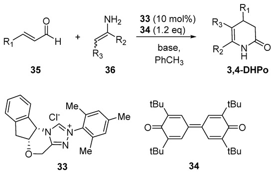 Wanner et al. published the enantioselective synthesis of (R)-3,4-DHPo through N-Heterocyclic carbene (NHC)-catalyzed aza-Claisen reaction of enal (35) and enamine (36) in the presence of N-mesityl catalyst (33) and oxidant (34); the better bases were DBU, NMM, and i-Pr2Net, showing higher enantioselectivity with 60% to quantitative yields, and 79–96% enantiomeric excess (Scheme 18) [13].