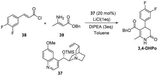 Vellalath et al. described the enantioselective nucleophile catalyzed Michael/proton transfer/lactamization cascade with 3,4-difluorocinnamoyl chloride (37) and the enamine (39) in the presence of 37 as a catalyst with a nonpolar solvent and LiCl as an additive, which affected enantioselectivity; this mild process delivered 3,4-DHPo derivative in 78% yield and 92% ee (Scheme 19) [67].