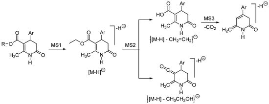 - Suárez, M.; Martínez-Alvarez, R.; Martín, N.; Verdecia, Y.; Ochoa, E.; Alba, L.; Seoane, C.; Kayali, N. Electrospray Ionisation and Ion-Trap Fragmentation of Substituted 3,4-Dihydro-2(1H)-Pyridin-2-Ones. Rapid Commun. Mass Spectrom. 2002, 16, 749–754. [Google Scholar] [CrossRef]