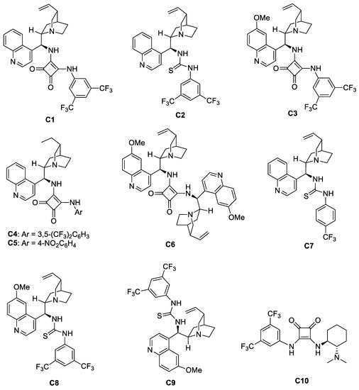 Initially, we started our study with hydroxymaleimide 1a (3-ethyl-4-hydroxy-1-phenyl-1H-pyrrole-2,5-dione) and 2-hydroxynitrostyrene 2a as model substrates. We first tested the feasibility of the model reaction in the presence of 10 mol% cinchona-derived squaramide bifunctional catalyst C1 (Figure 2) in dichloromethane (DCM) at room temperature. Under these conditions, the desired product 3aa was obtained in high yield (82%) with excellent diastereoselectivity (>20:1 dr), although with moderate enantioselectivity (53% ee). Encouraged by this important result and inspired by our previous work [32,33], we tried to reduce the reaction temperature to −16 °C to improve the enantioselectivity. Luckily, the results improved to 80% yield, >20:1 dr, and 87% ee. Furthermore, we tried to screen several catalysts, reaction solvent, and catalyst loading to further improve the outcome and enantioselectivity. The results are outlined in Table 1.
