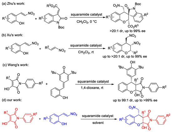 2-Hydroxynitrostyrene plays an essential role in these reactions in the construction of chiral chroman derivatives. For example, in 2013, Zhu’s group reported a new asymmetric oxa-Michael/Michael cascade reaction for the construction of enantiomerically enriched indolinone spiro-fused chromans; this protocol offered excellent stereo control under mild conditions [27] (Scheme 1a). In 2018, Xu’s group developed an asymmetric catalytic method for the synthesis of polysubstituted chromans through an oxa-Michael-nitro-Michael reaction, and the squaramide-catalyzed domino reaction of 2-hydroxynitrostyrenes with trans-β-nitroolefins produced chiral chromans with excellent enantioselectivities, diastereoselectivities and yields [28] (Scheme 1b). At the same time, because of the importance of the 2,5-pyrrolidinedione framework in biomedicine [29,30], Wang’s group synthesized chiral chroman-fused pyrrolidinediones for the first time in excellent yields with excellent stereoselectivities using organocatalytic enantioselective [4+2] cyclization reaction [31] (Scheme 1c). Inspired by their work and continuing with our project with organocatalyzed domino or cascade reactions for the synthesis of bioactive heterocycles, we intend to synthesize chiral chroman-fused pyrrolidinediones using 2-hydroxynitrostyrenes as substrates to consolidate and develop this research result (Scheme 1d).