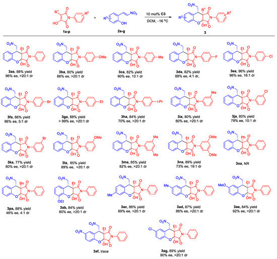 Substrate scope for chroman-fused pyrrolidinediones 3. The reactions were carried out with 1 (0.10 mmol), 2 (0.12 mmol), and catalyst C3 (10 mol%) in DCM (1.0 mL) at −16 °C for 24 h. The yields were isolated after column chromatography. The dr values were determined by 1H NMR and the ee values were determined by HPLC analysis.