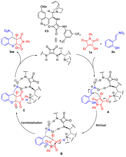 Based on these experimental results and previous work [33], we proposed a plausible mechanism based on the absolute configuration of 3aa (Scheme 5). In the first step of Michael addition, the squaramide catalyst C3 initially promotes the formation of transition state A, and catalyst C3 works in a double activation model. 2-Hydroxynitrostyrene 2a is oriented and activated by the squaramide moiety through double hydrogen bonding and the OH group in 1a is deprotoned by the tertiary amine unit to form enolate, which is oriented by another hydrogen bond. 2-Hydroxynitrostyrene 2a is attacked by the enolate of 1a from the Si-face. In the second step of the hemiketalization reaction, the OH group in 2-hydroxynitrostyrene 2a is deprotoned by the tertiary amine unit in squaramide, and the newly formed carbonyl group in 1a is attacked by the deprotonated phenolic hydroxyl of 2a from the Si-face via transition state B, leading to the formation of (3aS,9S,9aR)-configured 3aa and regenerates the bifunctional catalyst C3 after a protonation process.