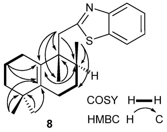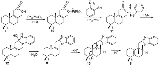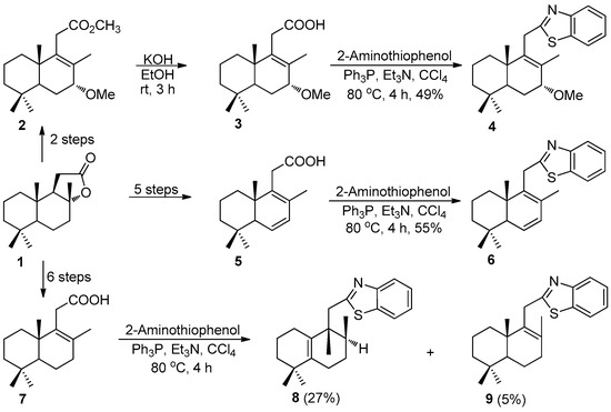Further, the one-pot decarboxylative cyclization reactions of acids 3, 5, and 7 with 2-aminothiophenol promoted by triphenylphosphine and triethylamine [21] were performed under reflux for 4 h, which after silica gel chromatography afforded 2-homodrimenyl-1,3-benzothiazoles 4, 6, 8, and 9, in the yields as depicted in Scheme 1.