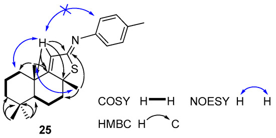 In the NOESY spectrum of compound 25, there is no NOE correlation between C11-H and C2′-H from the aromatic ring (Figure 2) that clearly indicates the E-configuration for C12 = N- double bond.
