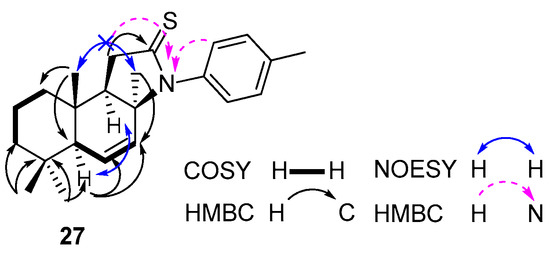 Selected COSY, HMBC, NOESY, and HMBC correlations for compound 27.