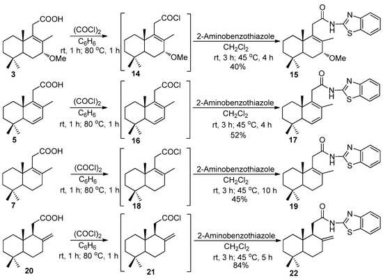 Next, a series of new N-homodrimenoyl-2-amino-1,3-benzothiazoles were prepared, starting from the intermediate carboxylic acids 3, 5, 7, and 20, via their acyl chlorides 14, 16, 18, and 21, generated in situ in 25–65% yields. It should be mentioned that the acid 20 was obtained from the commercially available (+)-sclareolide (1) in 6 steps, with an overall yield of 60%, according to the known method [11]. The desired N-substituted 2-amino-1,3-benzothiazoles 15, 17, 19, and 22 were obtained with yields between 40–84% by acylation of 2-amino-1,3-benzothiazole with the mentioned sesquiterpene acyl chlorides under the mentioned conditions (Scheme 3).