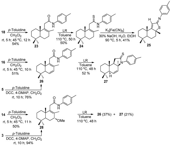 An attempt to perform the direct amidation of acids 3 and 5 with p-toluidine in the presence of N,N′-dicyclohexylcarbodiimide (DCC) and 4-dimethylaminopyridine (4-DMAP) gave better results, because the yields of amides 26 and 28 increased up to 76% and 94%, respectively (Scheme 4). Together with the signals of protons from terpene units, the proton spectra of amides 23, 26, and 28 contained the singlets of C4′-bonded methyl in a range of 2.30–2.32 ppm and doublets of aromatic protons from 7.11 ppm to 7.37 ppm, and a broad singlet of the amidic proton at 7.53–7.70 ppm. The structures of the mentioned compounds were fully confirmed by the 13C NMR spectra.