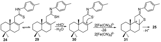 Returning to the compound 25, it can be said that its formation in place of the desired benzothiazole is due to the reaction conditions and the molecular structure of thioamide 24 which permits the existence of a tautomeric thioketo-enothiol 24<—>29 system. In the basic medium, the tautomer 29 easily generated enothiolate which due to the activation by hexacyanofferate ions attacked the C8-C9 double bond and generated the intermediate carbocation 30 (Scheme 5). In such a way, the formation the new C8-S bond occurred simultaneously with the one C11-proton elimination giving compound 25.