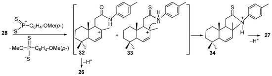 The formation of compound 27 can be explained by a sequence of transformations depicted in Scheme 6. In this case, the Lawesson’s reagent played a double role. The first role is to interact with axial the C7–bonded methoxy group of the amide 28, stimulating its elimination and generating the carbocation 32 which by deprotonation offered amide 26 (see Scheme 4 and Scheme 6). On the other hand, the thionation with Lawesson’s reagent gave an intermediate carbocation 33 which suffered a cyclization followed by deprotonation into cyclic thioamide 27. Note that there are several resonance structures, but from our point of view, intermediates 32 and 33 are more stable.