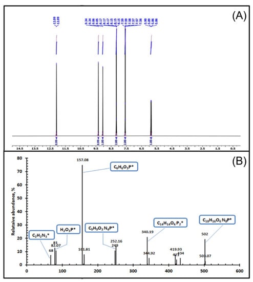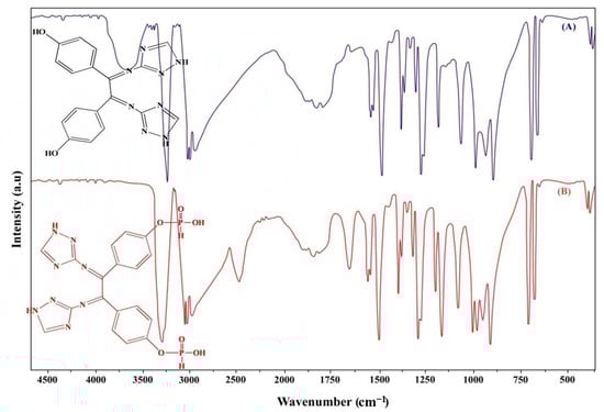 1H-NMR (400.15 MHz, CDCl3, 25 °C, TMS) δ, ppm: 12.09 (d, J = 1.4 Hz, 2H, -NH group), 9.34 (d, J = 1.3 Hz, 2H, -CH of triazole ring protons), 9.05 (d, J = 3.3 Hz, 2H, -OH group), 7.58–8.17 (d, 8H, benzene ring), 5.88 (d, J = 14.3 Hz, 2H, -PH group). 1H-NMR analysis with the energy of 400.15 MHZ and CDCl3 as a diluent is an operational and cooperative tool which gives significant data about protons in the synthesized triazole derv. ligand which contributes to the structure prediction. The main δ (ppm) assignments appear at 12.09 ppm which is related to the more de-shielded protons of the NH group. It was observed that the assignment of -OH protons (δ = 9.05 ppm) is also de-shielded but less than -NH protons (δ = 12.09 ppm). The two assignments of benzene ring protons and the -PH group were noticed at a chemical shift of 7.58–8.17 and 5.88 ppm, respectively. The characterization of triazole derivatives and chelating ligand using 1H-NMR are shown in Figure 2A.