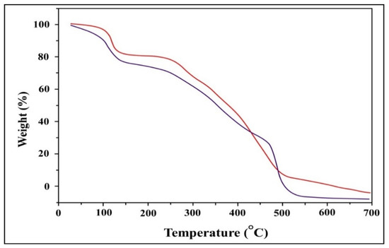 The TGA curve for TIHP (RED) (Figure 3) shows a mass loss at 25–121 °C because of the loss of surface water molecules, the 2nd mass loss was observed at 122–237 °C because of the loss of coordinated water molecules or crystal lattice water molecules, and loss of NH3 [40]. The 3rd loss was observed at a temperature range of 238–500 °C which can be attributed to the evolution of the Schiff base ligand as CO and CO2 and creating carbonaceous waste. The last mass loss was observed at a temperature range of 500–700 °C due to the decomposition of the phosphonic acid group [41].