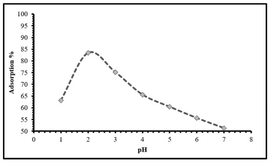 The sorbent surface’s acid-base properties are significantly influenced by pH, and this in effect has a major impact on the adsorption effectiveness. The higher quantity of H+ ions formed at low pH values (pH = 2) led to superior chromium (VI) adsorption capability. Chromium anionic forms, such as Cr2O72−, HCrO4−, or CrO42− can be produced in solutions with pH values ranging between 2 and 12 [44]. When pH rises to 6, on the other hand, the extra OH ions in the solution raise the hindrance to dichromate ion diffusion [45].