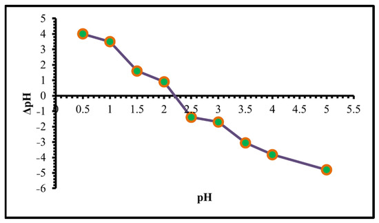 The pH of zero point of charge (pH pzc) or the isoelectric point is the point at which the adsorbent surface charge becomes zero or the pH value at which the surface anionic and cationic charges of the TIHP are equal. When the pH < pHzpc, the TIHP surface turns cationic due to protonation. On the other hand, when the solution pH > pHzpc, the surface is negative which cationic ions prefer for adsorption [51,52]. The pHpzc value for TIHP is 2.2. which indicates that the TIHP adsorbent surface acts as cationic due to protonation, as seen in Figure 5.