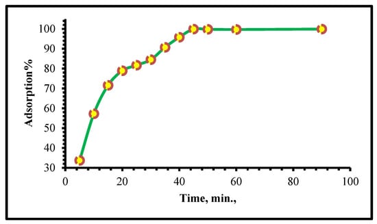 In Figure 7, the Cr(VI) adsorption capacity is shown as the meaning of the interaction time for TIHP adsorbent at a pH value of 2 and an initial Cr(VI) concentration of 250 mg/L. The results indicate that the equilibrium is achieved within 40 min. Furthermore, it is marked that the uptake of Cr(VI) is fast at the beginning; more than 75% of the initial Cr(VI) quantity is adsorbed after 20 min, while at equilibrium, the rest of the Cr(VI) percentage is adsorbed so that from Figure 7 the equilibrium time for this study is 45 min.