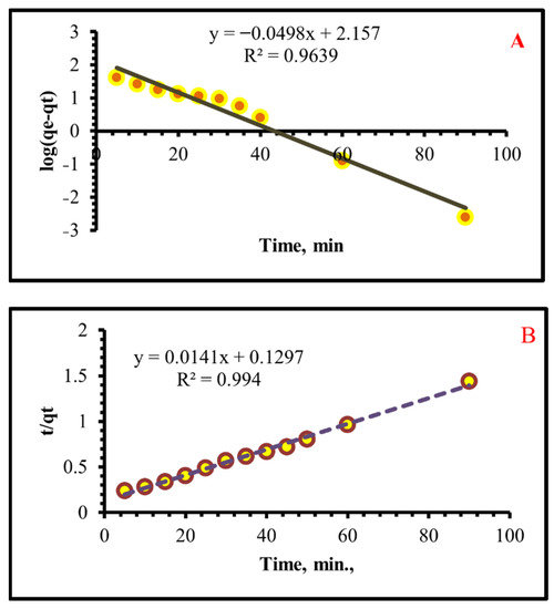 Adsorption kinetics is critical since it sheds light on the reaction routes and mechanisms. Pseudo-first and second-order models were applied to study the uptake kinetics of Cr (VI) on THIP [53,54]. Approximately, 0.08 g of TIHP adsorbent was added to 250 mg L−1 Cr(VI) concentration (20 mL) for analysis. In this case, we lowered the original pH to 2. At a constant agitation speed of 150 revolutions per minute (RPM), the concentrations of Cr(VI) solution phase were measured at intervals of 5–90 min. Linear pseudo-first-order and second-order models were used to study the kinetics of Cr(VI) adsorption. The pseudo-first-order equation can be stated as follows [55]: