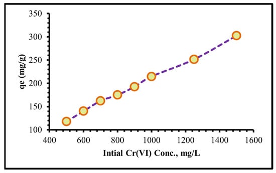 At a pH of 2, initial concentrations of Cr(VI) solutions ranging from 250 to 1500 mg/L were extended, and the appropriate amount of adsorbent (0.08 g) was used in adsorption tests at 25 °C. As illustrated in Figure 10, the % of Cr(VI) that can be eliminated depends upon the concentration of Cr(VI). It was shown that as the starting concentration was raised, so was the adsorption effectiveness. The ratio of initial moles of Cr(VI) to accessible uptake surface area on TIHP increases with lower initial Cr(VI) concentration. The mass transfer driving forces increase as the initial concentration of Cr(VI) increases, resulting in significant Cr(VI) adsorption. As a result, an initial concentration of 1250 mg/L of TIHP adsorbent was found to be best in this experiment.