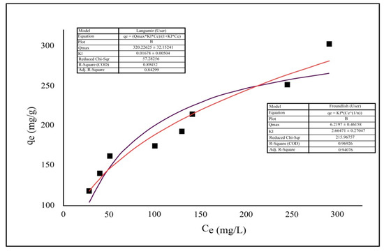 The intraparticle diffusion model discovered a relationship between Cr(VI) concentration and the square root of time (Fickian diffusion law [56]; qt = Ki t0.5 + C,), which is not linear, as seen in Figure S3. This means that the adsorbent’s overall adsorption rate is regulated by this factor, namely, interparticle diffusion and the diffusion of the boundary layer. qt against t0.5 crosses the origin when intraparticle diffusion is the only rate-limiting step. During film diffusion, the intercept is C, which indicates the thickness of the boundary layer’s film layer. From Figure S3, it is clear that the adsorption process was two steps. Intraparticle diffusion is shown by the next straight line after boundary layer diffusion. [56].