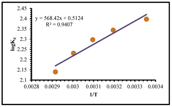 From the linear plots of log (qe − qt) vs. time for pseudo-first order (Figure 8a) or (t/qe) vs. time for second-order (Figure 8b), the kinetic factors that control the two models can be found. The applicability of each model is tested by the appropriateness of the straight line (R2). A straight line is used as a test of each model’s validity (R2). Suppository first and second-order rate constants were provided in Table 2, along with equilibrium sorption capacities. The pseudo-second-order model is better adapted for the adsorption process than the other model of pseudo-first order, as shown in Table 2 for the TIHP adsorbent and the consistency of the predicted value and experimental value of qe. Adsorption follows a pseudo-second-order process and depends on the amount of Cr(VI) ions and the texture of the resin.