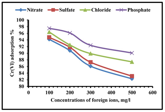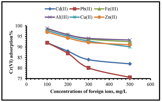 One of the most commonly detected toxins in the environment is Cr(VI), which is extremely hazardous to living things and may cause cancer in people. There are two types of chromium: Cr(VI) and (III). As a nutrient, Cr(III) is vital for animals, due to its ability to conserve active glucose, protein, and lipid metabolism [1]. In contrast, because it can permeate across cell membranes as CrO42− or HCrO4−, Cr(VI) is extremely harmful. The consumption of water contaminated with Cr(VI) poses health problems due to its toxicity [2]. The permissible limit concentration for Cr(VI) ions in drinking water is less than 50 µg/L, as recommended by the World Health Organization (WHO) and the United States Environmental Protection Agency (USEPA) [3,4]. In industrial operations such as the tanning of leather, electroplating, preservation of wood, dye manufacture, and the production of paint and paper, as well as petroleum refining activities, chromium is produced in significant quantities. Concentrations of Cr in states of (VI) and (III) in the effluents from these businesses range from tens to hundreds of milligrams per litre, depending on the process.