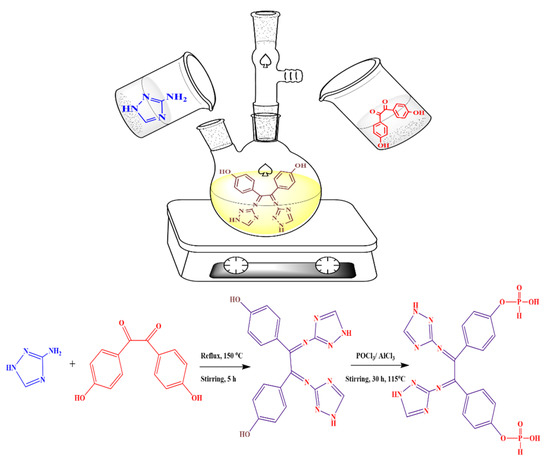 The aluminium chloride (AlCl3) and sodium hydroxide were supplied by Scharlau Chemie Company S.A. (Barcelona, Spain), 3-Amino-1H-1,2,4-triazole was purchased from Thermo Fisher Scientific-Acros Organics Inc. ((Morris Plains, NJ, USA), 4,4’-Dihydroxybenzil and DMF were obtained from Fluka (Charlotte, NC, England). Ethanol, isopropanol and phosphoryl trichloride were obtained from Sigma-Aldrich (St. Louis, MO, USA). Prior to usage, the solvents were purified and decontaminated using fixed scientific techniques and then newly distilled to ensure extreme effectiveness. All procedures were carried out in flame-dried glassware. The progress of the reaction was detected using thin paper chromatography (PC). The mixture of (ethyl acetate + ethanol 50:50 v/v) as an eluent has been used as spots on the thin paper chromatography plates which have been identified with a simple UV lamp at 250 nm.