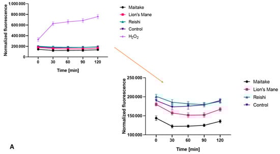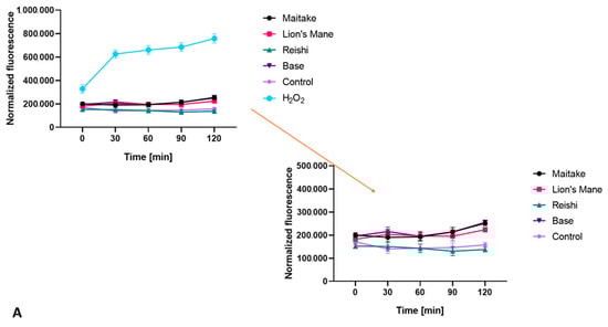 Both for the extracts and for the prepared cosmetics containing the analyzed mushrooms, a test was carried out to detect the ability of the compounds to generate intracellular production of reactive oxygen species. The test was performed using fluorogenic H2DCFDA dye, which is oxidized inside cells into highly fluorescent 20,70-dichlorofluorescein in the presence of ROS.