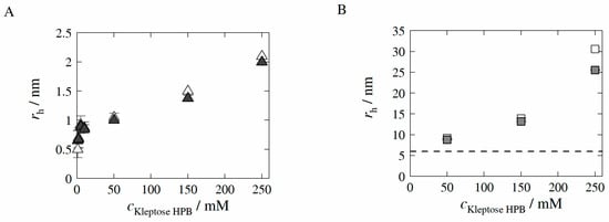 In order to identify the aggregation propensity of Kleptose®HPB in absence (auto-association) as well as in presence of model protein HB-IgG-A, the hydrodynamic radii of possible particle/aggregate formation were determined experimentally by means of dynamic light scattering (see Section 2.2.1). All samples were measured unfiltered, and filtered using a PES syringe filter (pore size: 0.2 µm). Experimentally determined -values are illustrated in Figure 2 for aqueous Kleptose®HPB solution (A) and Kleptose®HPB—HB-IgG-A solutions (B) as a function of Kleptose®HPB concentration.