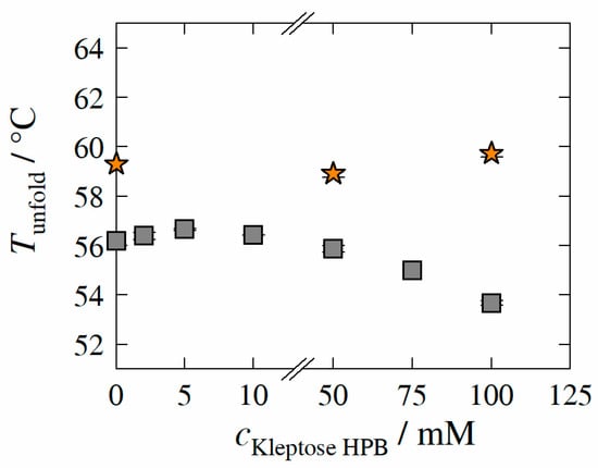 Experimentally determined unfolding temperature Tunfold of HB-IgG-A (gray square) and adalimumab (orange star) as function of Kleptose®HPB concentration. Data are valid for protein concentrations of 30 mg mL−1 (HB-IgG-A) or 8 g L−1 (adalimumab), pH 7 (HB-IgG-A) or pH 5.2 (adalimumab) in 50 mM K2HPO4-NaH2PO4-solution and a heating rate of 0.5 K min−1 in the temperature range of 20–85 °C.