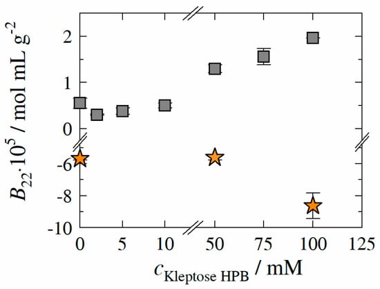 In order to provide a holistic insight into the molecular interactions, -values of HB-IgG-A or adalimumab in the presence of different Kleptose®HPB concentrations were determined experimentally as described in Section 2.2.4. The second osmotic virial coefficient serves as a determinant of protein–protein interactions (PPI) and thus as indicator for colloidal mAb stability. Figure 6 illustrates the results of -measurements of HB-IgG-A (gray squares) or adalimumab (orange stars) as a function of Kleptose®HPB concentration.