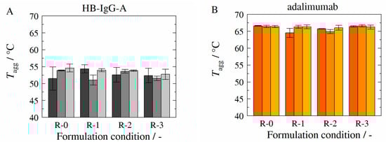Furthermore, we investigated the influence of Kleptose®HPB on the stability of HB-IgG-A and adalimumab under both storage (4 °C) and accelerated, stressed (40 °C) conditions by means of aggregation temperature Tagg, melting temperature Tm and aggregate fraction of the respective protein. Based on these results obtained, we provide a holistic conclusion on the potential of Kleptose®HPB as a “multi-role” excipient within HCPFs.