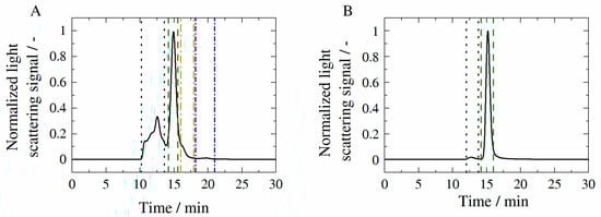 As described in our previous study [45], the SEC-MALS setup used consists of Q1260 Infinity II Quarternary system from Agilent Technologies (Santa Clara, CA, USA) including a pumping and degassing unit (G7111B), an auto sampler (G7129A), a SEC column (Superdex 200 Increase 10/300 GL) from Cytiva (Marlborough, MA, USA), a diode array detector (G7115A), a RI-detector (G7162A), and a light scattering detector (miniDAWN, Wyatt Technology Corporation, Santa Barbara, CA, USA). The detection with the diode array detector was performed at a wavelength of 280 nm.