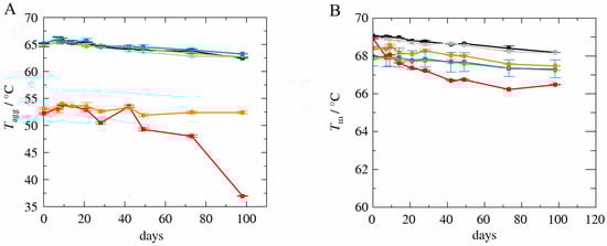 The unfolding, melting, and aggregation temperature of proteins (, , and , respectively) can be determined simultaneously by using the Prometheus NT 0.48 from NanoTemper (Munich, Germany), due to combined measurement principles of nano differential fluorimetry and light scattering [29,30,31,32,33,34].