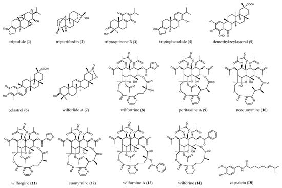 - Brinker, A.M.; Ma, J.; Lipsky, P.E.; Raskin, I. Medicinal chemistry and pharmacology of genus Tripterygium (Celastraceae). Phytochemistry 2007, 68, 732–766. [Google Scholar] [CrossRef] [PubMed] [Green Version]