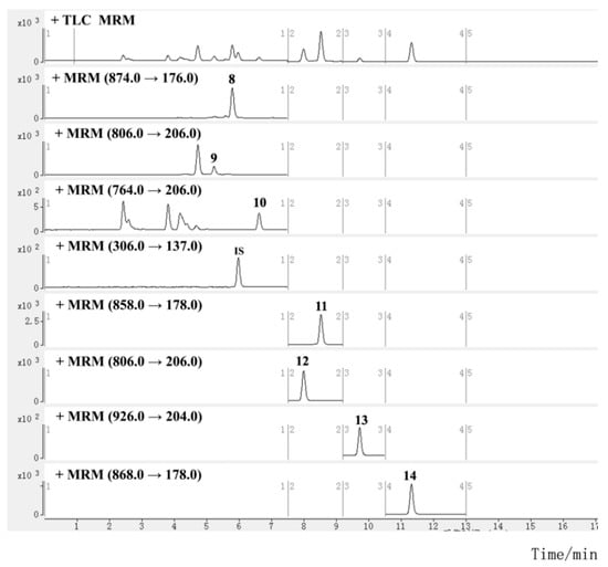 MRM chromatograms for investigated sesquiterpene alkaloids in TGTs (sample S2, the peak numbers correspond to the compound numbers in Figure 1).