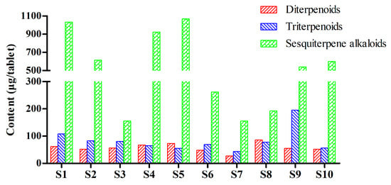 The developed RRLC–ESI–MS/MS method was subsequently applied in the quantitative analysis of ten batches of TGTs from different manufacturers. The results are listed in Table 5 and Figure 4. Sesquiterpene alkaloids were present in the preparations in relatively high concentrations compared to the other two types of components, but they also varied the most between manufacturers. The total content ranged from 105.76 to 1067.67 µg/tablet, with above 500 µg/tablet in the samples S1, S2, S4, S5, S9, and S10 and below 300 µg/tablet in the other samples. Among the seven investigated alkaloids, wilfortrine (8), paritassine A (9), wilforgine (11), and wilforine (14) were the most abundant in all the samples except for S3, in which wilfortrine was the only alkaloid with a high content. For diterpenoids and triterpenoids, wilforlide A (7), an indicator component in the current CFDA quality standard, was relatively abundant in the various TGTs, with contents ranging from 22.15 to 82.82 µg/tablet, with higher levels above 80 g/tablet in S1, moderate levels ranging from 40 to 70 µg/tablet in S2, S3, S4, S5, S6, S8, and S10, and lower levels below 30 µg/tablet in S7 and S9. The contents of the other analytes varied greatly between samples. It is noteworthy that the celastrol (6) content in S9 reached 147.88 μg/tablet, which was significantly higher than in other samples. In addition, triptolide (1), another standard indicator component, was present in samples at 0–11.67 μg/tablet, with S1, S4 and S5 having higher levels above 9 µg/tablet, S2, S9, and S10 having moderate levels ranging from 5 to 8 µg/tablet, and S3, S6, S7 and S8 having lower levels below 3 µg/tablet, or even having undetectable levels. Tripterifordin (2), triptoquinone B (3), triptophenolide (4), and demethylzeylasteral (5) were relatively abundant in S1, S3, S8, and S9, respectively. These results indicate that the chemical profiles of TGTs from different manufacturers are quite different, which may further influence the therapeutic effects and toxicity of the preparations.