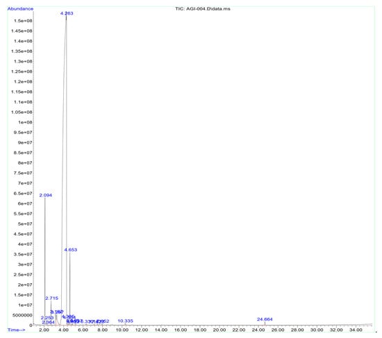 The machine was led by the computer system ″HP ChemStation″, managing the functioning of the machine and allowing us to follow the evolution of chromatographic analyses. Diluted samples (1/20 in methanol) of 1 μL were injected manually. In addition, 70 eV ionization voltage, 230 °C ion source temperature, and a 35–450 (m/z) scanning range were the MS operating conditions. Finally, the qualitative quantification of the different compounds was based on the percent area of each peak of the sample compounds and was confirmed by reference to their MS identities (Library of NIST/EPA/NIH MASS SPECTRAL LIBRARY Version 2.0, build 1 July 2002).